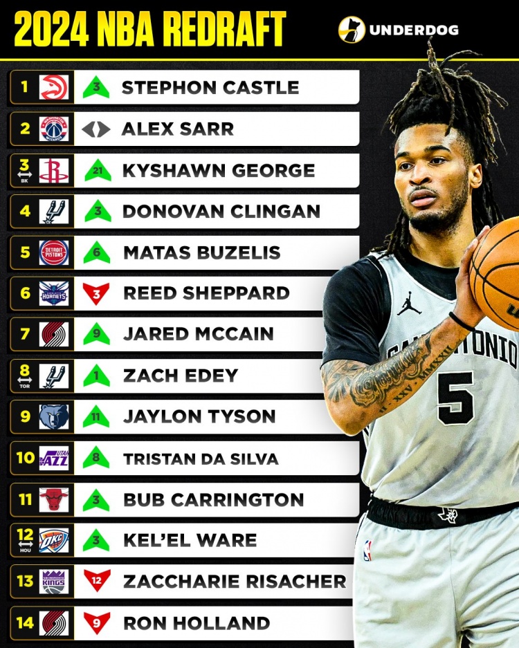 美媒重排2024届新秀 卡斯尔逆袭状元 里萨谢跌至13