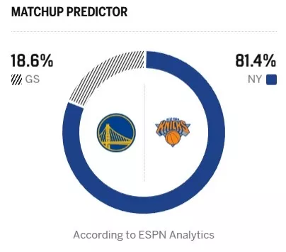 ESPN预测勇士客战尼克斯胜率不足两成 唐斯复出追梦缺阵