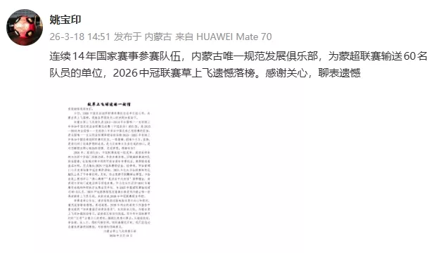 内蒙古草上飞缺席2026中冠报名 俱乐部称市足协领导坚持不同意参赛